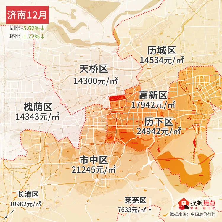济南12月均价为15405元/㎡同比下跌-5.62%↓,环比下跌-1.72%↓