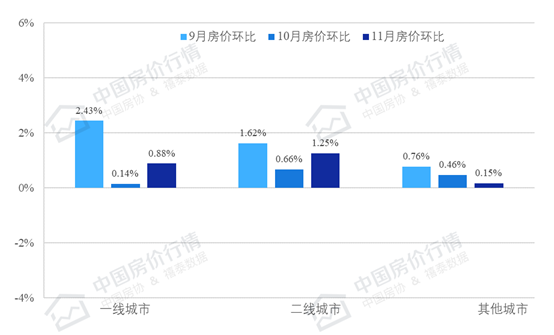 从各级城市房价涨跌变化趋势来看,一线城市房价全部上涨,其中深圳和北京涨幅较大,二手房价格环比涨幅分别为7.58%和3.98%,广州和上海微幅上涨。二线城市房价整体微幅上涨,个别城市涨幅较大。其中,福州环比涨幅超过5%,长沙环比涨幅超过3%,杭州本月微涨,目前已连续五个月上涨,东莞全年涨幅猛超47%。下跌的城市中,石家庄、济南、青岛、苏州、太原、哈尔滨、宜昌等城市同环比双跌,其他城市基本稳定。