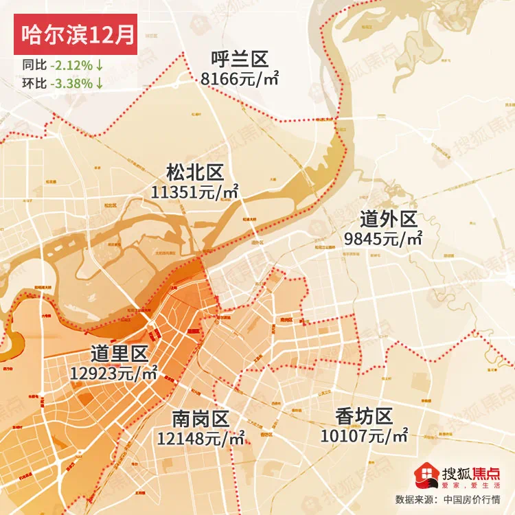 哈尔滨12月均价为10778元/㎡同比下跌-2.12%↓,环比下跌-3.38%↓