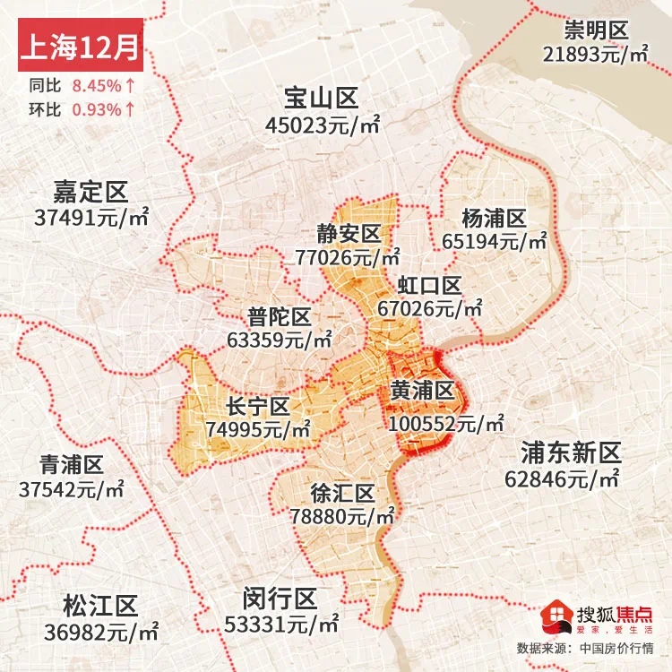 上海12月均价为59072元/㎡同比上涨8.45%↑,环比上涨0.93%↑