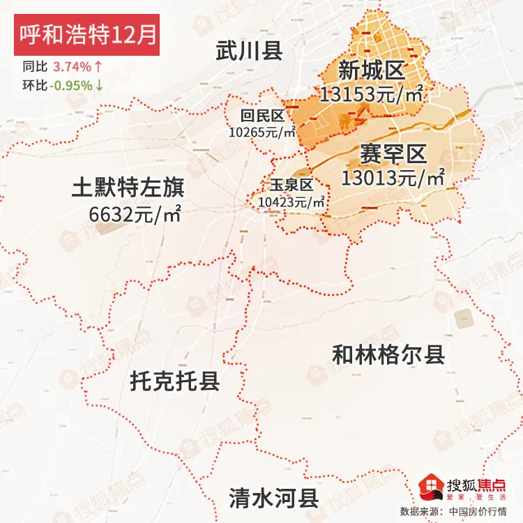 呼和浩特12月均价为11794元/㎡同比上涨3.74%↑,环比下跌-0.95%↓