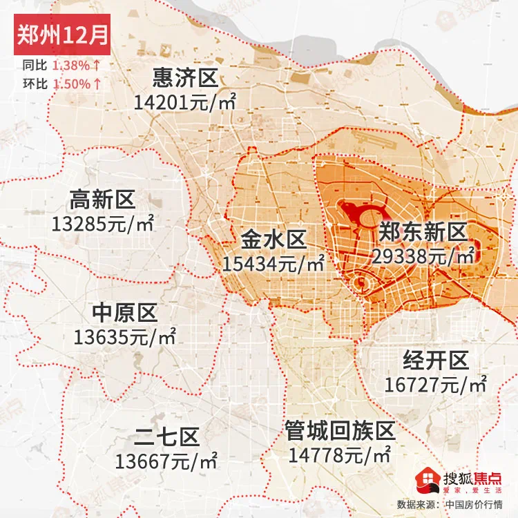 郑州12月均价为14266元/㎡同比上涨1.38%↑,环比上涨1.50%↑