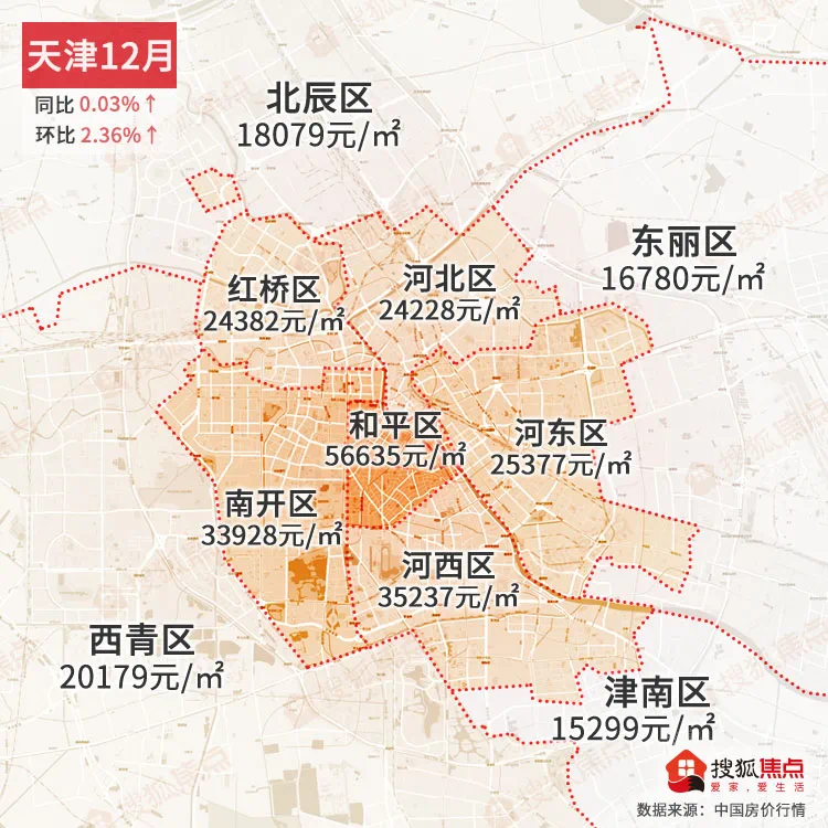 天津12月均价为26332元/㎡同比上涨0.03%↑,环比上涨2.36%↑