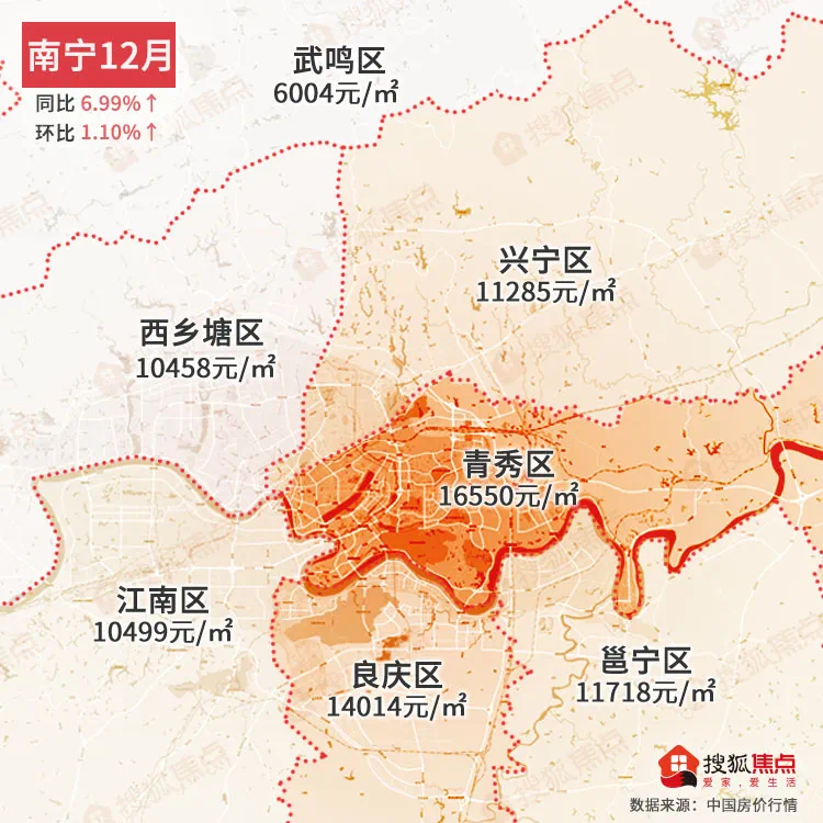 南宁12月均价为13102元/㎡同比上涨6.99%↑,环比上涨1.10%↑