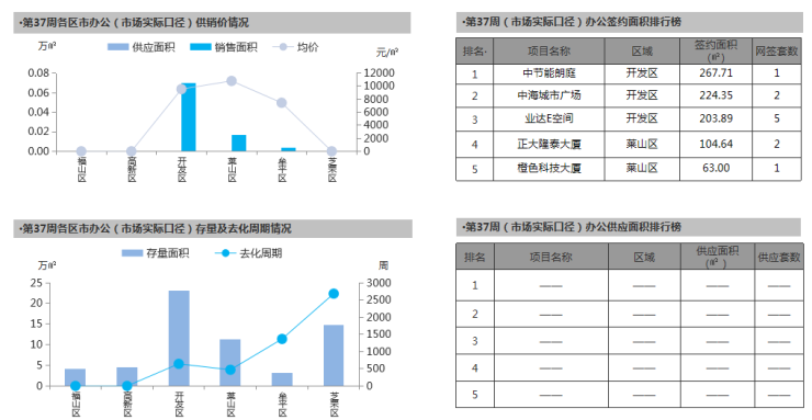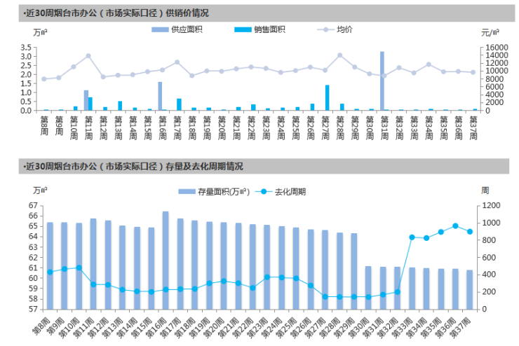 【区域市场】本周办公市场无新增供应,成交主要来自开发区;开发区存量较高,芝罘区去化周期最长;中节能 朗庭项目为周度办公市场销冠。