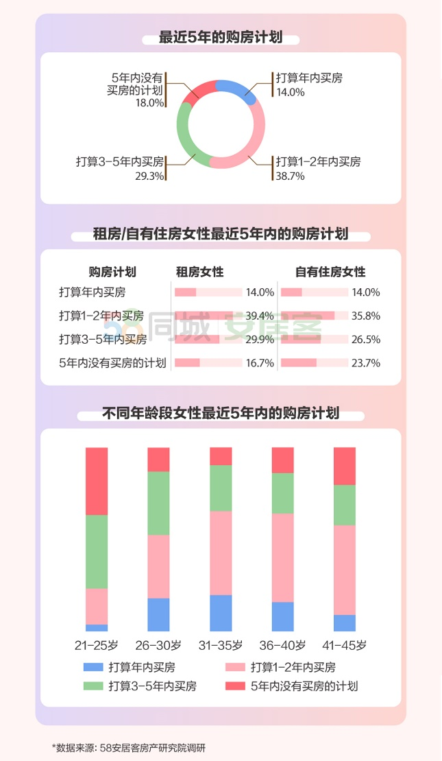 58同城、安居客《2021年女性置业报告》调查显示,有82%的女性计划在5年内置业,其中打算今年买房的女性占比14%,近四成女性打算两年内买房,其中计划5年内购房的租房女性人数占比要高于自有住房女性。