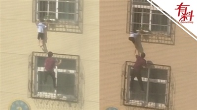 9月11日,山东聊城一男童卡在4楼窗外,身体悬空。一位红衣大哥徒手爬上4楼托举孩子,直到消防员赶到将二人救下。