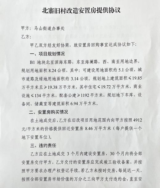 土地成交后,竞得人在旧改项目用地范围内向马山街道办事处按照4912元/平的价格提供回迁安置房8.46万平方米(每户提供一个地下安置车位)。同时,竞得人应在土地成交3个月内建设安置房,30个月内将全部安置房交付马山街道办事处,延期需支付违约金。