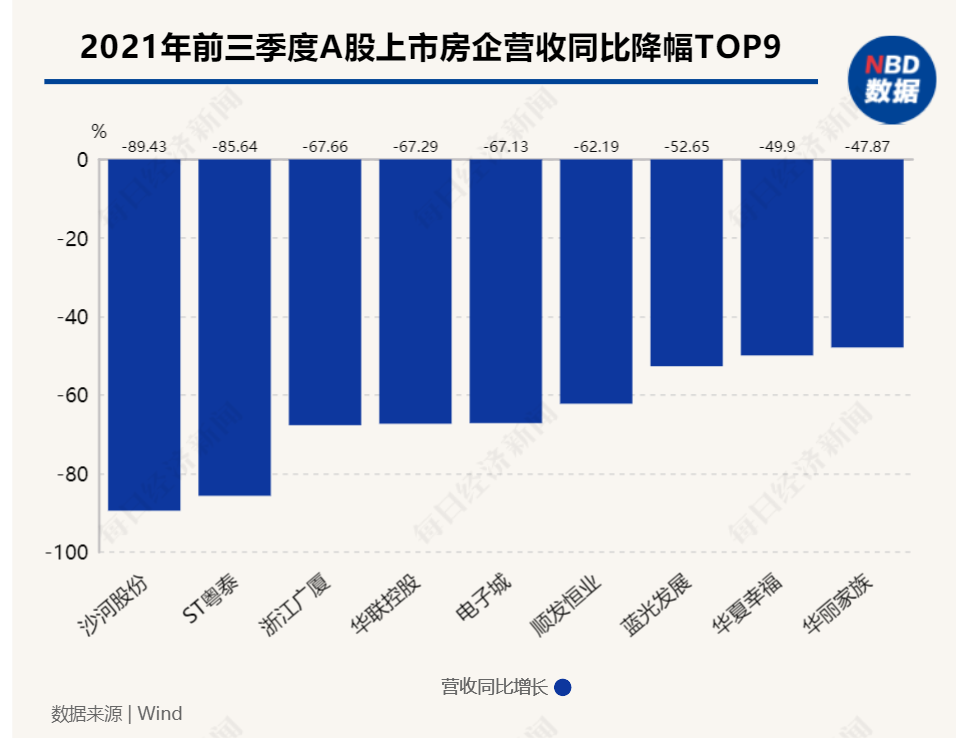 Wind数据显示,截至目前,在已经披露三季报的上百家A股房企中,43家出现营业收入同比下滑,59家出现归母净利润下降。