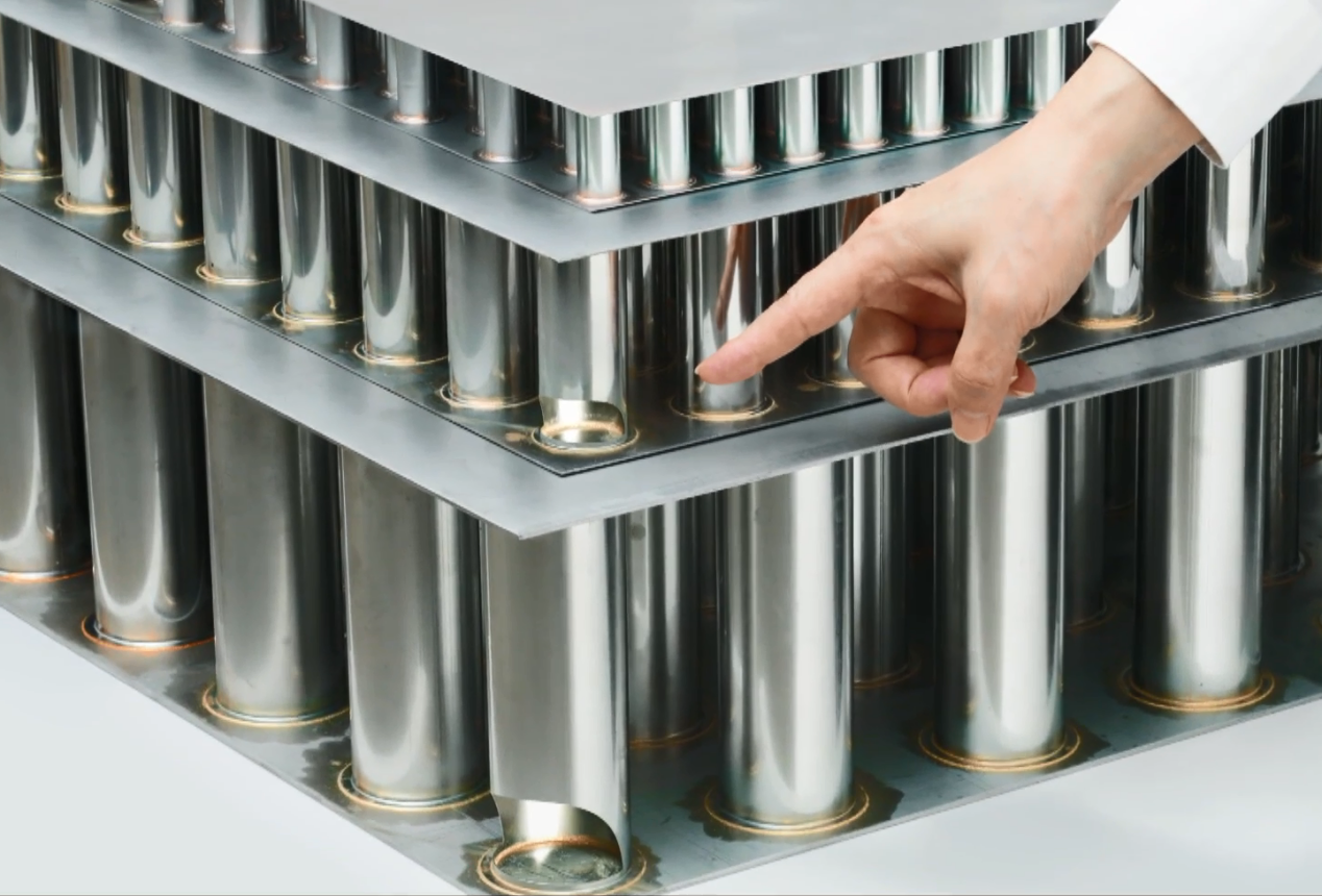 作为“活楼”主体材料的不锈钢芯板,上下有两片不锈钢板,中间夹一层圆芯管阵列,采用远大特别发明的热风铜钎焊技术焊接,强度比同等质量不锈钢扩大几十倍。这是目前应用在建筑领域强度较高韧性较大的材料,可以有效地提高抗震抗台风能力。