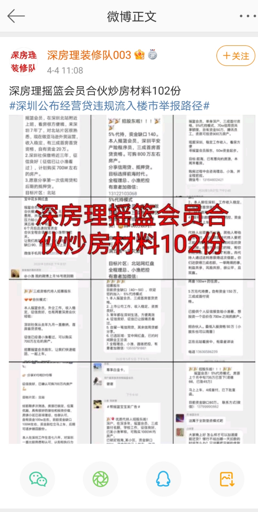 4月初,微博网友@深房理装修队003曝光102份材料,公开举报“深房理”会员有用经营贷买房、控盘哄抬房价、借名代持、制造虚假流水等违规操作。