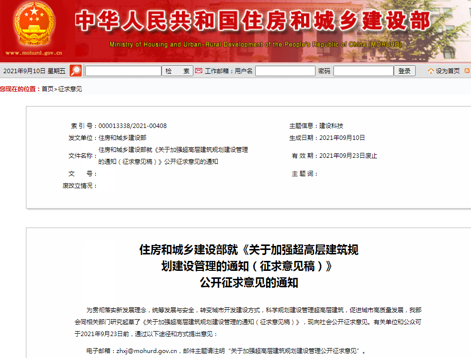 9月10日,住房和城乡建设部在官网发布《关于加强超高层建筑规划建设管理的通知(征求意见稿)》,向社会公开征求意见。