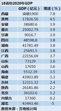 18省份公布2020年GDP:西藏、贵州经济增速领跑