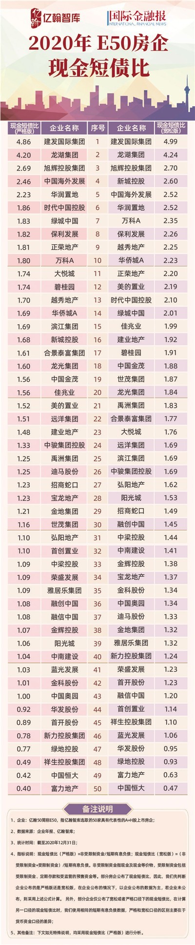 亿翰智库统计数据显示,2020年,50家典型房企平均现金短债比为1.48,较2019年1.64有所下降。