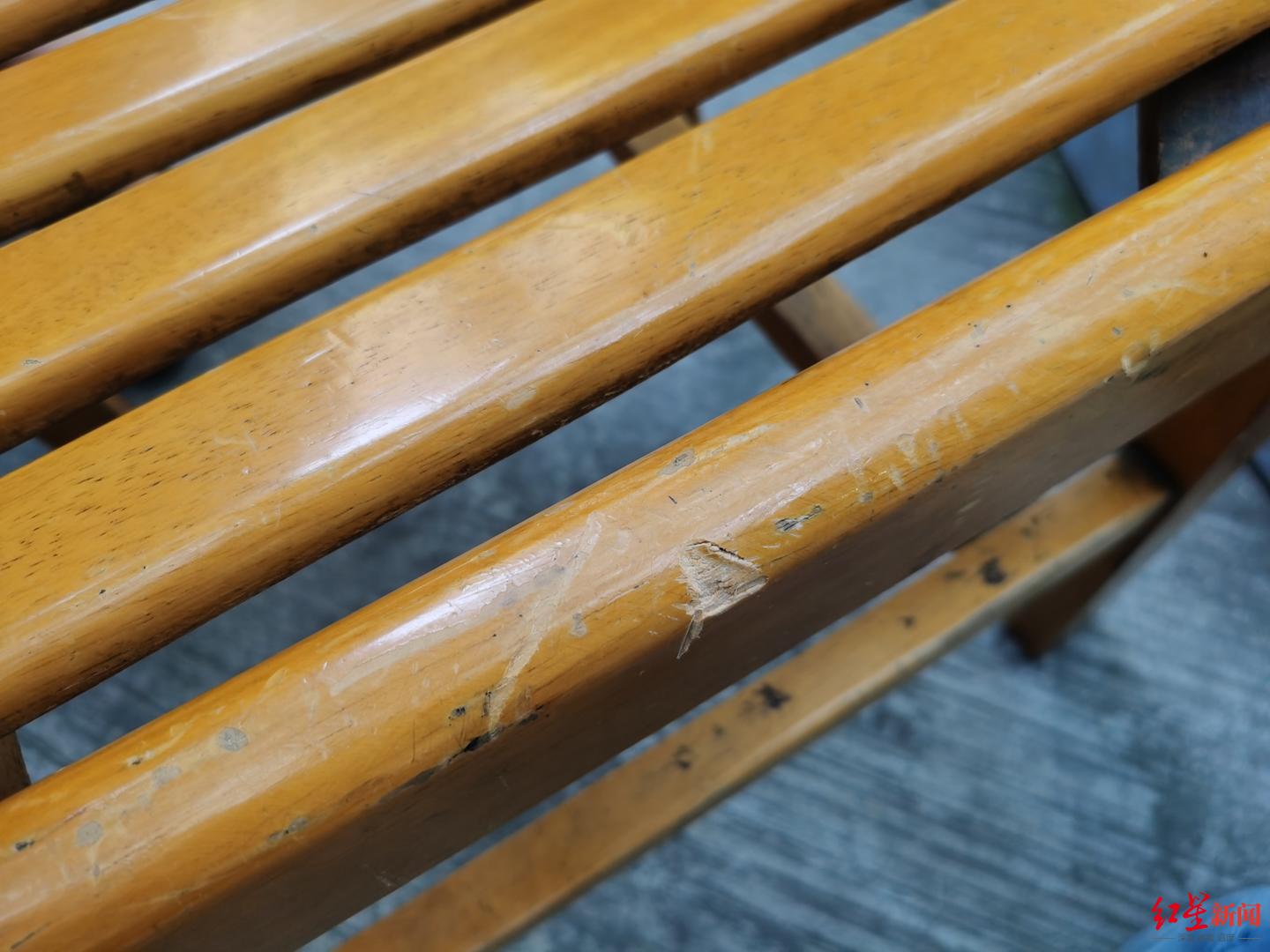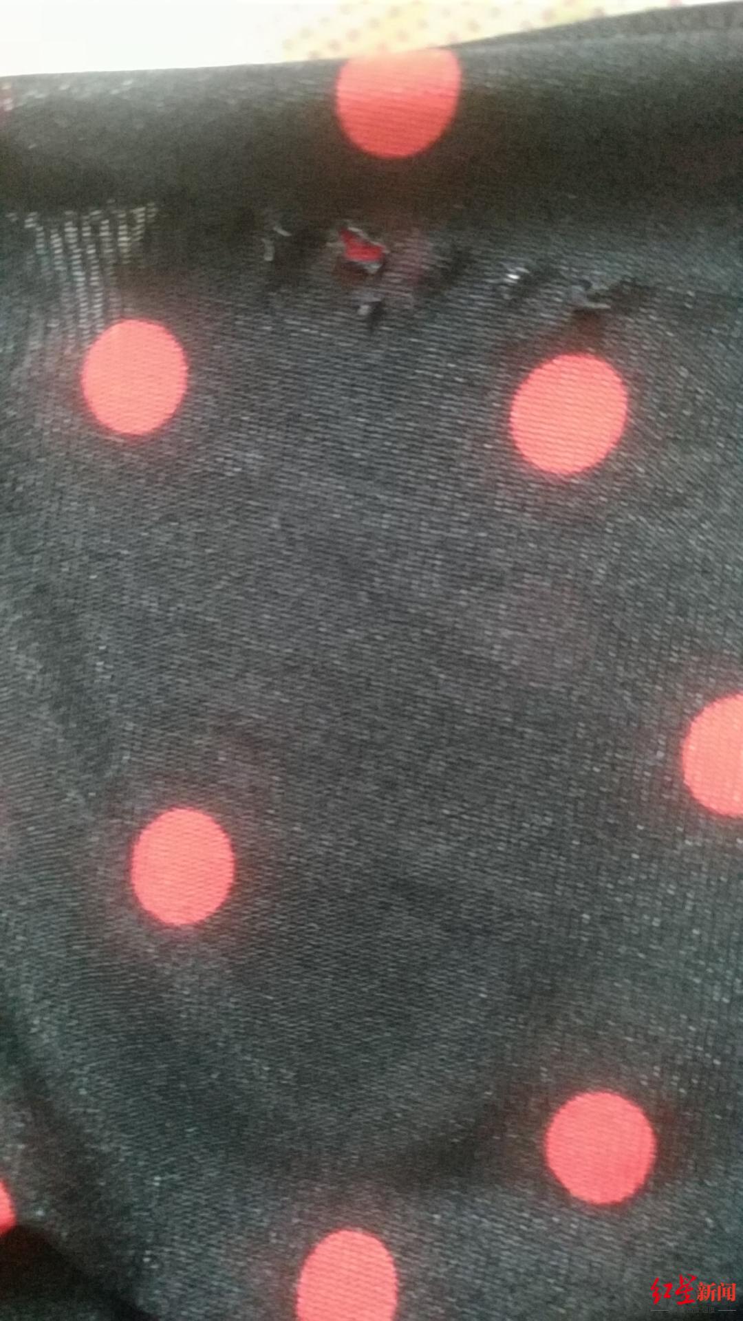 曾大姐指着椅子上一处缺口说:“这就是那天被剪刀砸出来的。”红星新闻记者看到,椅子边缘有一处明显的凹陷和划痕。她表示,剪刀落下时擦着自己的右胳膊,在裙子上还留下了两个洞,“要是再偏一点,剪刀砸中的就是我的肩膀或者脑袋了……”