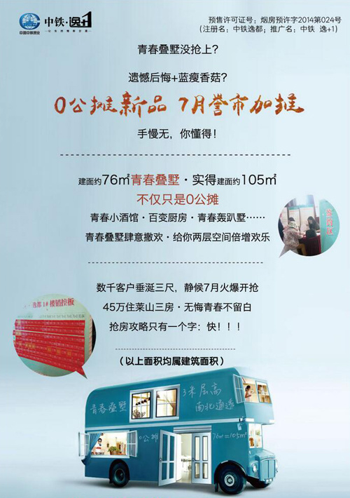 中铁逸+1,0公摊新品,7月誉市加推! 如果青春不曾放肆 老来何以话说当年? 放肆撒欢,就要在青春叠墅里。 既能安静发功,又能放肆发疯, 拒绝一层不变 的生活, 就要随心所欲的空间, 遗憾上次没抢到, 没关系,机会来啦! 中铁逸+1青春叠墅,新品誉市加推!