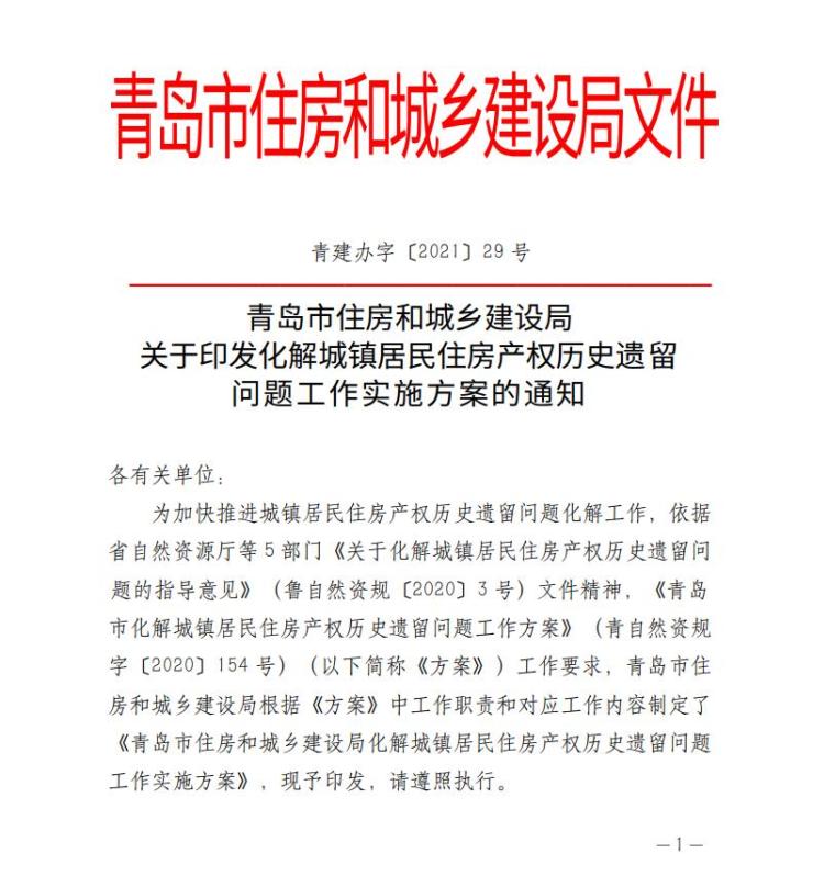 近日,青岛市住房和城乡建设局公布了《关于印发化解城镇居民住房产权历史遗留问题工作实施方案的通知》。