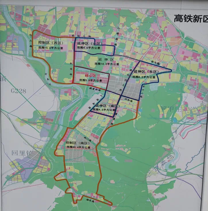 在高铁新区的整体规划中,南站升级后属于核心区,同时还有延伸区以及控制区等总计93.9平方公里的新区空间。