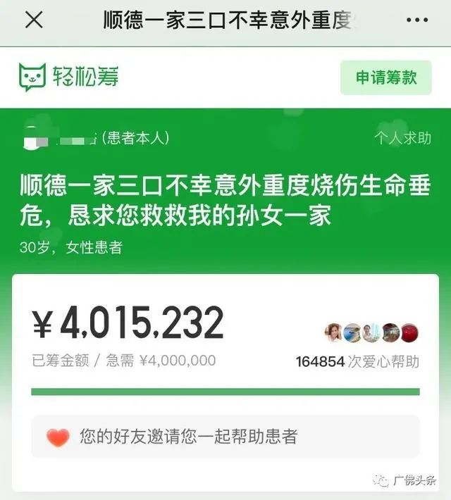 有车有房的病号众筹巨额医药费,救还是不救?近日,广东顺德某烧伤家庭在众筹医药费时遇到了争议。事情起源于一场意外的汽车起火事故。8月12日,广东顺德两家人同乘一辆车出行,6个人均受到不同程度的烧伤,随后两个家庭先后发起众筹,两天内共筹到600万。随后,获得400万善款的梁姓烧伤家庭被曝出有房有车有产业,部分网友对这家人并不贫困却众筹治疗费提出质疑。