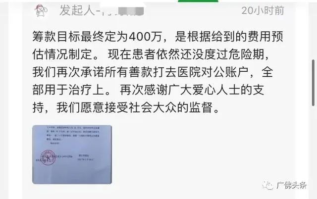 目前来说,无论如何救人是排名前列位的。对于网友的监督动作,众筹平台已更新表示承诺将所有善款打到医院对公账号,全部用于治疗上。且两家人也均作出承诺,后期事故认定如有赔付且能覆盖部分治疗费用,将剩余善款退回平台并按照比例全部返还给所有爱心人士。说到底,网友们有监督意识是好的,但也要有分辨能力,不被网络传言轻易带了节奏,毕竟保证费用用到治疗病患,又不至于出现过度筹资资金才是众筹医疗费的根本目的。文 | 丁慧原标题:《有车有房众筹400万医药费,救还是不救?》