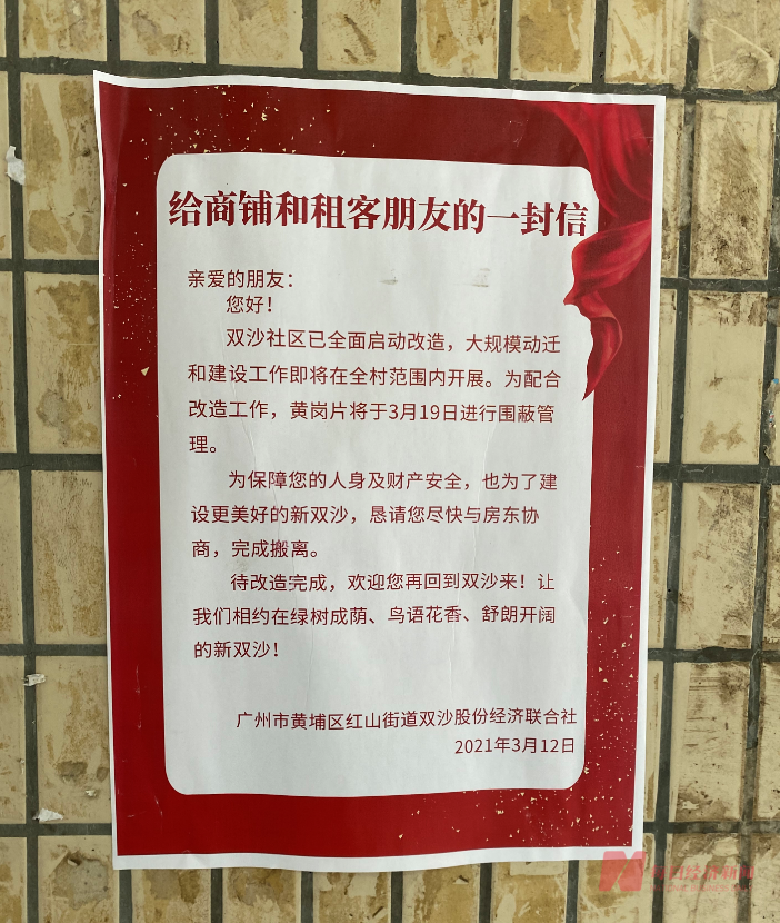 另外,还有一份双沙经联社在4月18日发出的一份《关于黄岗片区封闭管理的通知》显示,黄岗片区已纳入双沙旧改范围,定于4月30日前小区对黄岗片区进行封闭管理,仅限双岗、沙浦及黄岗的村民和业主可自由出入,请本片区租客于2021年4月30日前搬离。