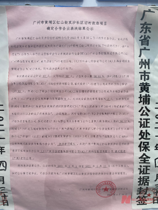 5月11日,广州市黄埔区红山街双沙社区旧村改造项目(以下简称“双沙旧改”)公开引入合作企业成交结果公示结束,广州本地房企合景泰富联合体战胜龙头房企万科成为最终赢家。
