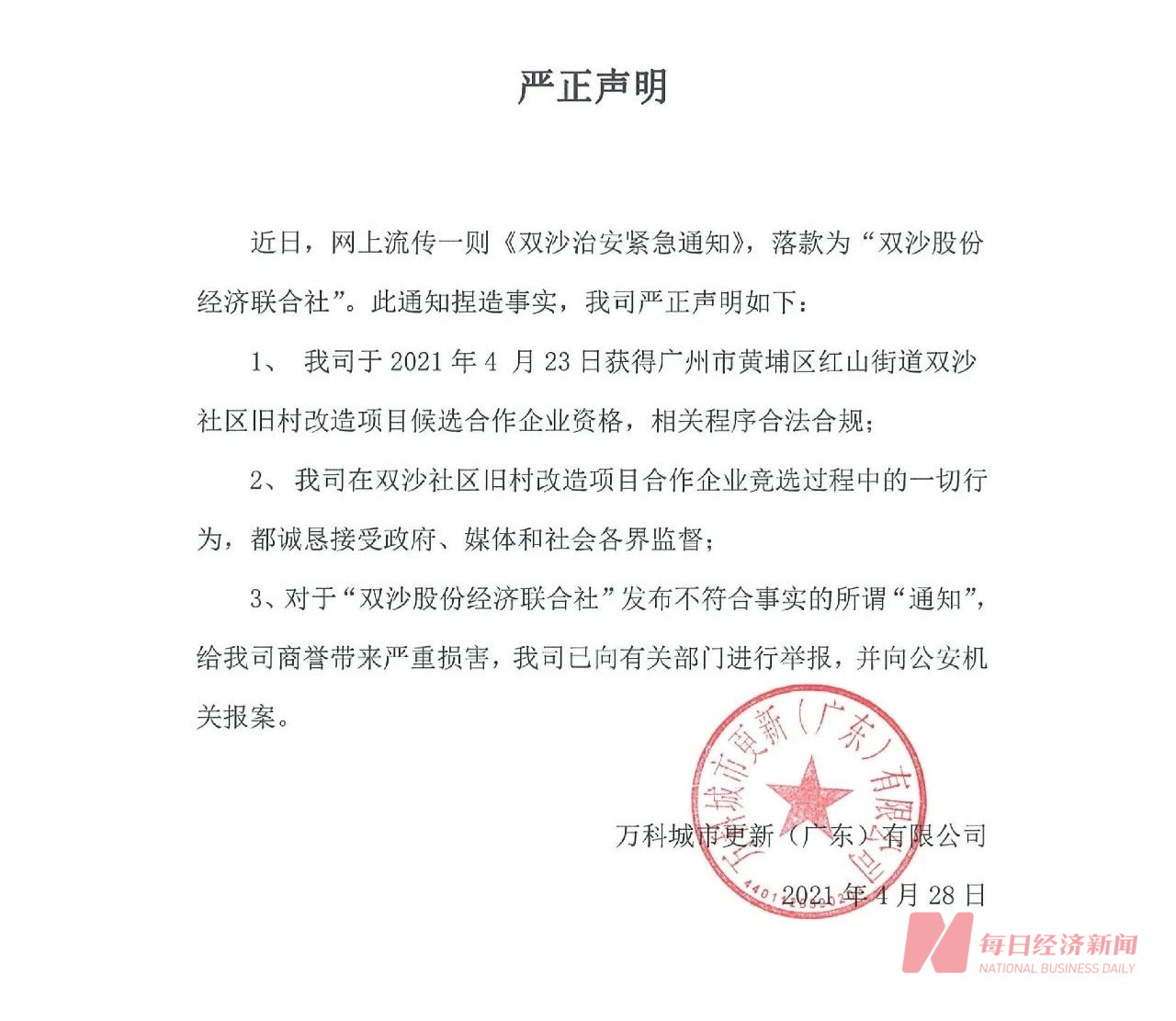 万科也不甘示弱,直接开杠。4月28日下午,万科城市更新(广东)有限公司发出一则《严正声明》表示,网上流传一则《双沙治安紧急通知》,落款为“双沙股份经济联合社”,此通知捏造事实。对于“双沙股份经济联合社”发布不符合事实的所谓“通知”,“给我司商誉带来严重损害,我司已向有关部门进行举报,并向公安机关报案。”