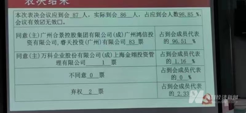 《每日经济新闻》记者特别获取的一份详细表决结果公示显示,该次表决会议应到会87人,实际到会86人,占应到会人数的98.85%。其中,同意合景泰富联合体的为83人,同意万科联合体的1人,弃权的2人。