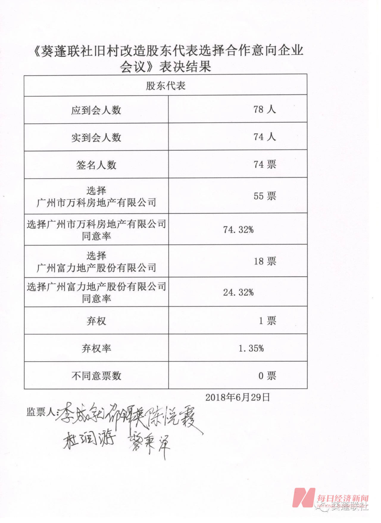 2018年6月29日,葵蓬经济联社组织召开股东代表大会表决选择合作意向企业,万科获得以55票、74.32%的同意率胜出。当时的竞争对手富力获得了18票,同意率24.32%。