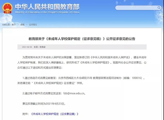 4月6日从教育部了解到,教育部日前就《未成年人学校保护规定(征求意见稿)》(以下简称《意见稿》)公开征求意见。意见稿对保证学生休息、预防校园欺凌、防治性侵等多方面作出明确规定。