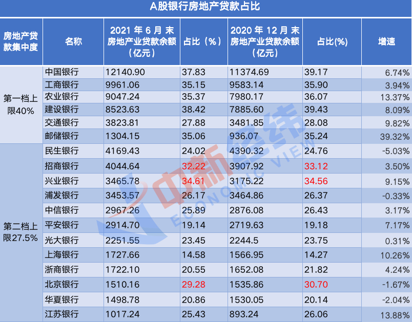 2020年12月31日,中国人民银行、中国银行保险监督管理委员会发布《关于建立银行业金融机构房地产贷款集中度管理制度的通知》(下称《通知》),根据银行业金融机构资产规模及机构类型,分档对房地产贷款集中度进行管理。根据《通知》,银行业金融机构分为5档:排名前列档为中资大型银行,包括6家国有大型商业银行和国家开发银行;第二档为中资中型银行,包括12家全国性股份制商业银行、北京银行、上海银行、江苏银行、农业发展银行、进出口银行;第三档为中资小型银行和非县域农合机构,包括第二档中的城市商业银行之外的城商行、民营银行、大中城市和城区农合机构;第四档为县域农合机构;第五档为村镇银行。五个档次的个人住房贷款占比上限分别为:32.5%、20%、17.5%、12.5%和7.5%。