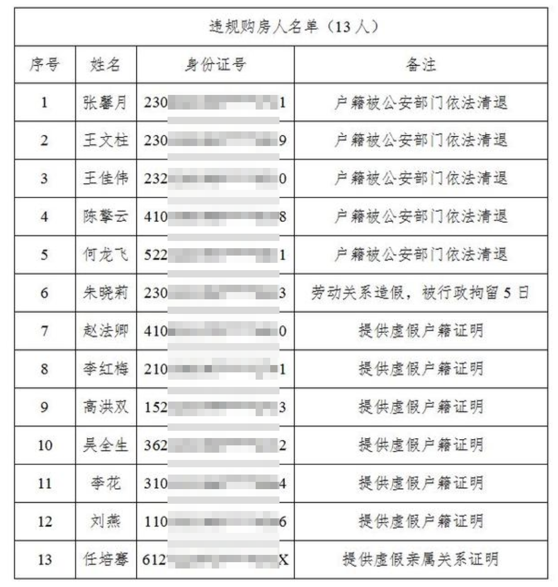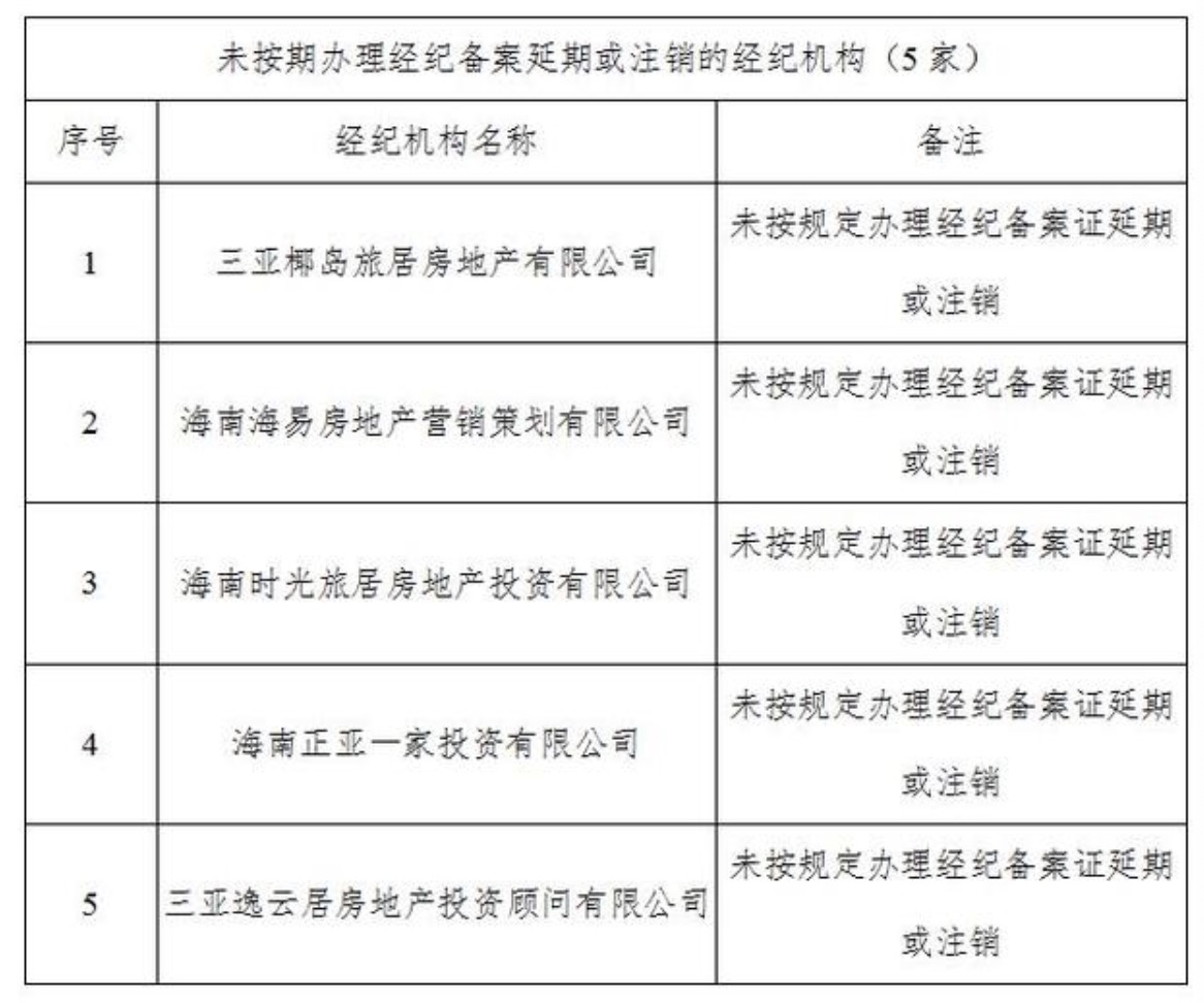 三亚市住房与城乡建设局决定,注销张馨月等12人购房合同网签备案,并将张馨月、任培骞等13人列入三亚市诚信体系黑名单,5年内不得在三亚市购房。同时,决定给予三亚椰岛旅居房地产有限公司等5家中介机构通报批评,并责令其于本通报发布之日起10日内,申请办理经纪机构相关业务。否则将直接注销其备案,一年内不得在三亚市办理房地产经纪备案手续。