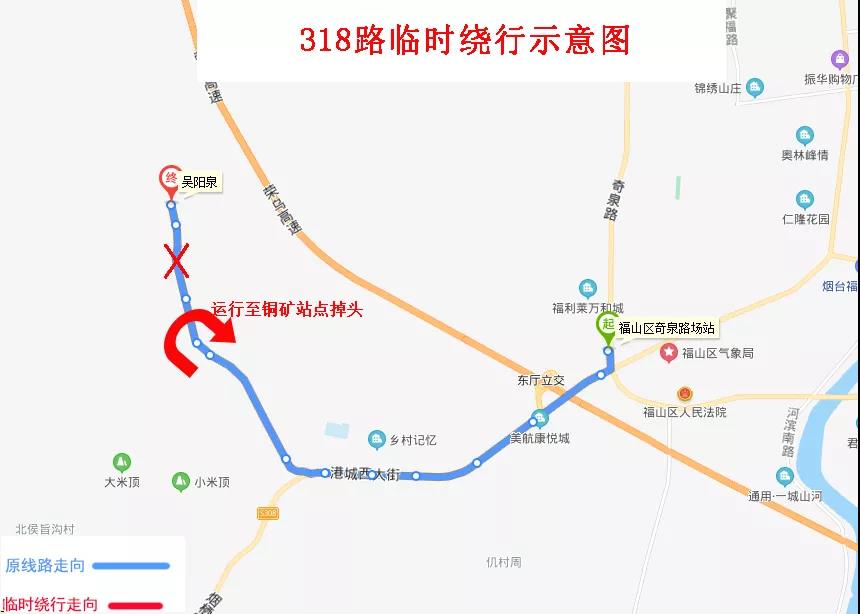 受福山区吴阳泉至王家庄路段高铁施工影响,5月15日(星期六)起,318路临时绕行,工期约7天,待具备通行条件后恢复原线路,具体方案如下: 由奇泉路场站发车,沿原线路行至“铜矿”站点掉头,沿原线路运行至奇泉路场站。 取消:王家庄、车家村、吴阳泉等3处站点。 来源:烟台公交集团