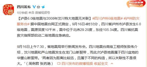 中新网9月16日电 据四川省人民政府新闻办公室官方微博消息,据中国地震台网正式测定,9月16日4时33分,四川省泸州市泸县发生6.0级地震,震源深度10千米,震中位于北纬29.20度,东经105.34度。四川省抗震救灾指挥部启动二级地震应急响应。 9月16日上午7:30,省地震局举行新闻发布会。四川