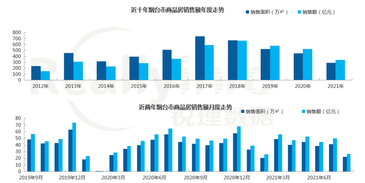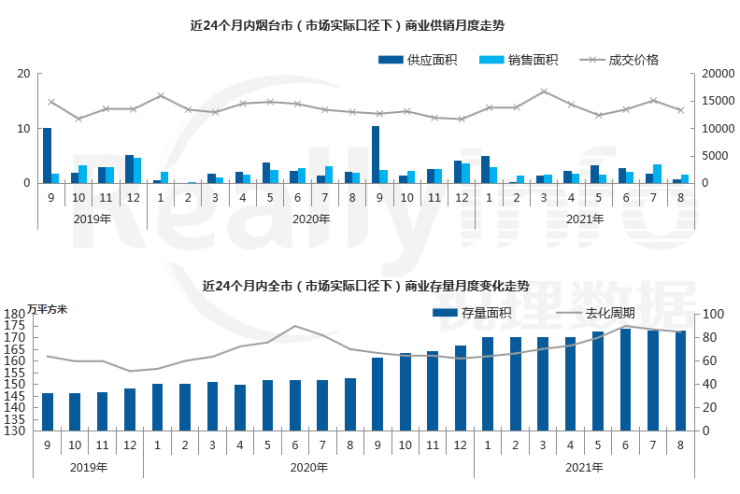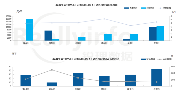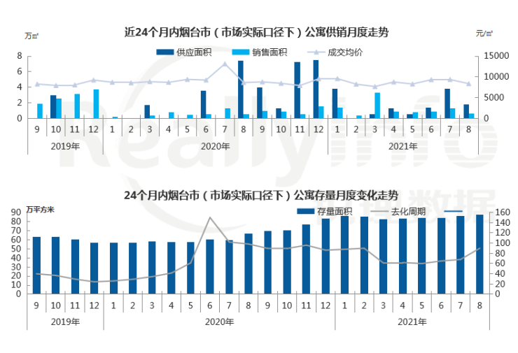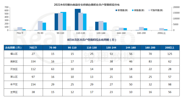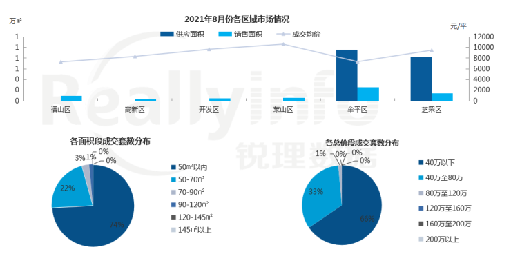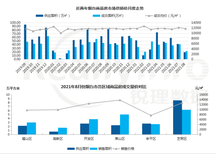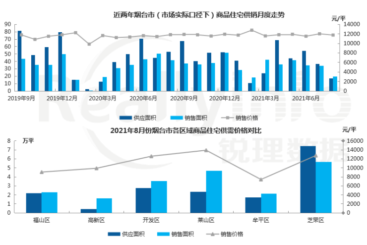2021年8月份全市商品住宅市场新增面积约16.83万平,环比减少54%,同比减少68%;销售面积约19.91万平,环比减少42%,同比减少52%;成交均价11761元/平,环比下跌2%,同比下跌1%。分区域看,芝罘区为供销两旺区域,新增面积约7.39万㎡,销售面积约5.65万㎡;莱山区成交价格较高为13916元/㎡。