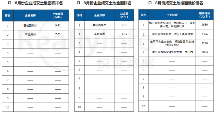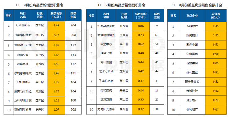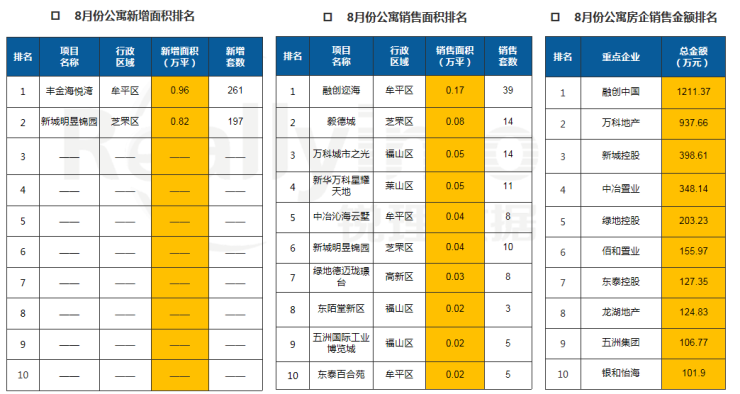 【公寓公寓排行榜】8月份公寓市场丰金海悦湾位居新增面积榜首,牟平区融创迩海居销售面积榜首位,融创中国位列 企业销售额榜首