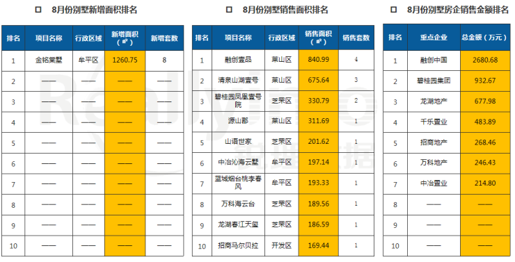 【别墅排行榜】8月,仅金铭棠墅有新增供应,融创壹品居销售面积榜首,融创中国为本月别墅房企销售金额首位