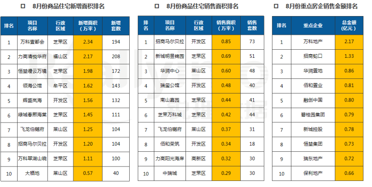 【商品住宅排行榜】8月份万科壹都会居新增面积榜首位,招商马尔贝拉销售面积榜首位,万科地产居本月企业销售额榜首