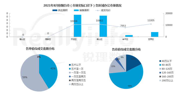 【办公区域对比】8月,办公市场无新增供应;开发区销售面积居首;1万-1.5万/㎡单价段和40-80万总价段占办公产品成交份额较大