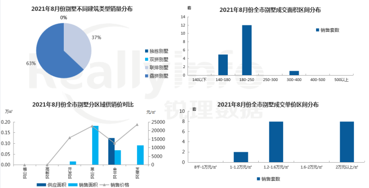 【别墅分维度分析】8月份,叠拼别墅为成交主力,成交主要集中在莱山区、芝罘区和牟平区;成交主力面积段为180-250㎡;单价1.2-1.6万和2万以上成交量最多