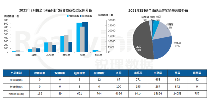 【商品住宅建筑类型】8月份高层成交最多,占比48%,其次是中高层;别墅产品成交量最少