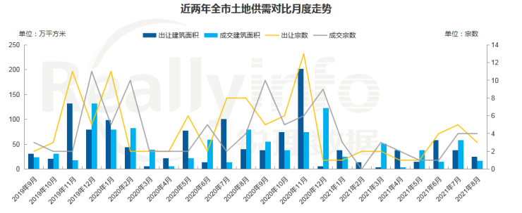 8月土地市场供应量下降,共出让土地3宗,建面约25.30万平,面积环比下降34%、同比下降36%;8月土地市场成交量上升,共成交土地4宗,建面约17.14万平,面积环比下降70%、同比下降78%。