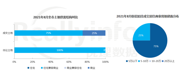 【土地结构】本月供应以住宅兼容商业及商业用地为主,成交为5万平的住宅兼容商业用地占75%