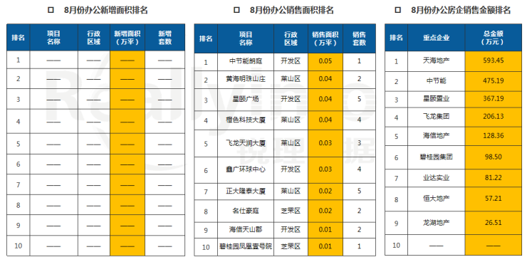 【办公排行榜】8月,办公市场无新增供应,中节能朗庭居销售面积榜首位,天海地产位居企业销售金额榜首位