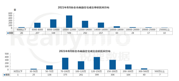 2021年8月份, 1-1.2万元/平之间单价段产品成交最多,占比30%,其次是8千-1万元/平单价段,占比20%;从总价来看,120-150万总价段成交量较大,共计399套,占比23%,其次为70-100万总价段,占比22%。