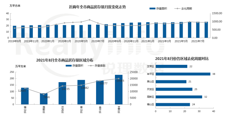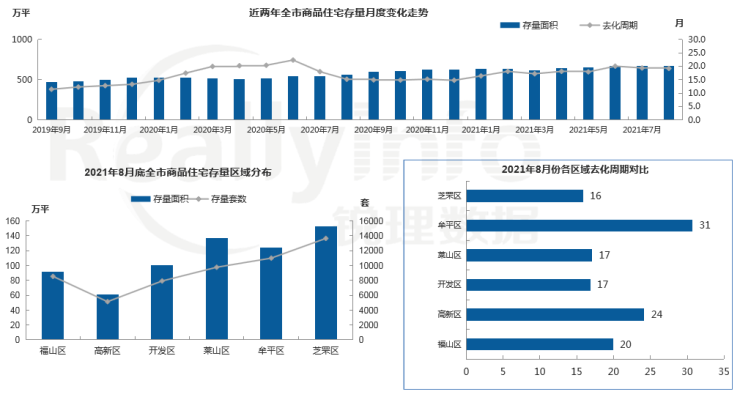 【商品房存量去化】截至8月末全市商品房存量991.41万平,去化周期为25个月。各区域中,芝罘区库存较高,高新区存量较低