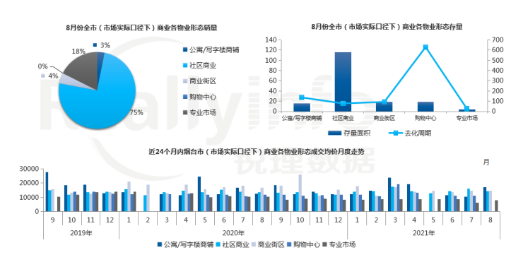 【商业物业形态】8月,商业市场中社区商业成交占比依旧较高,为市场需求主力;存量方面,社区商业存量依旧保持高位,购物中心去化周期最长;价格方面,本月商业市场除社区商业外各物业商业价格均有上涨