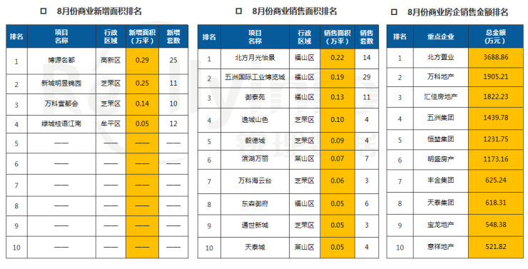 【商业排行榜】8月,博源名都项目居新增面积榜排名前列,北方月光怡景项目居销售面积榜首位,北方置业居本月企业销售额榜首