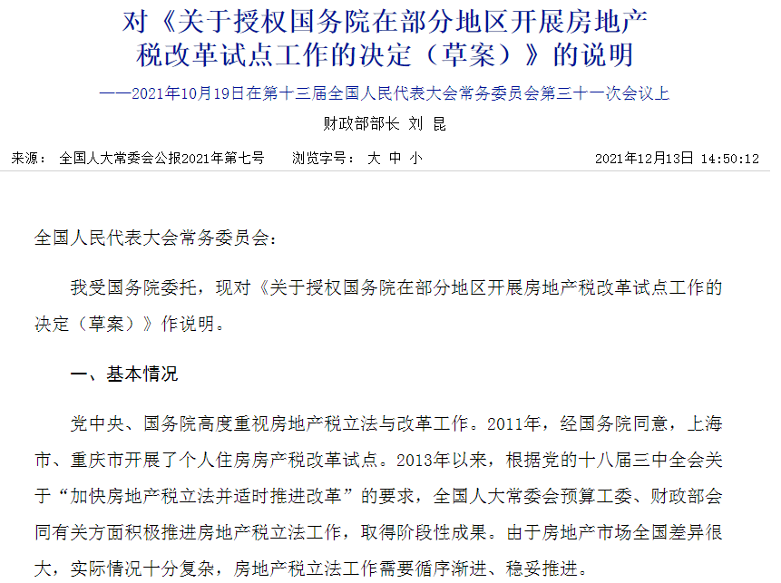 【环球网房产报道】12月13日,中国人大网公开了《关于授权国务院在部分地区开展房地产税改革试点工作的决定(草案)》的说明和《关于授权国务院在部分地区开展房地产税改革试点工作的决定(草案)》审议结果的报告。