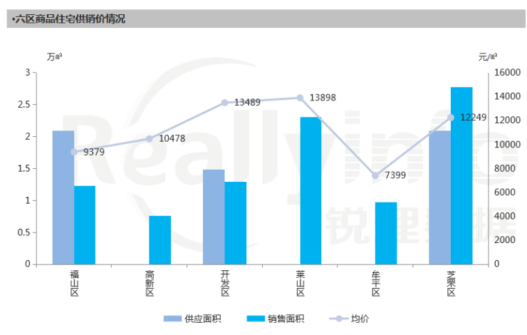 供应方面,本周福山区新增供应最多2.09万㎡,其次是芝罘区新增面积2.09万㎡;成交方面,本周芝罘区成交最多,成交面积2.78万㎡,其次为莱山区2.30万㎡;价格方面,莱山区价格较高,为13898/㎡;其次为开发区13489元/㎡。